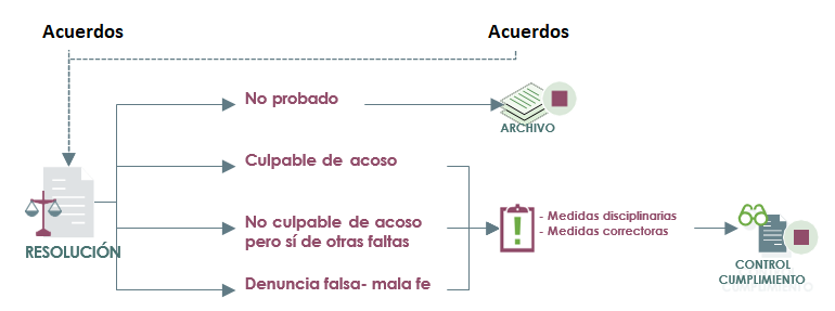 - Adopción de las medidas de todo orden, incluidas en su caso las de carácter disciplinario, contra la/s persona/s cuya/s conducta/s de acoso resulten acreditadas. Igualmente se considera reprobable y merecedora de reproche toda imputación, acusación o denuncia falsa en relación a estos comportamientos, adoptándose las medidas que sean necesarias.
